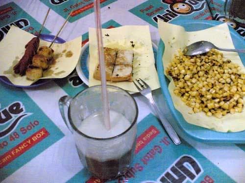 after that, we goin home, on the way home, we stop at near by post office, Solo.. theres a place selling jagung & pisang bakar / roast corn & banana (is it roast or bbq?). its not a shop or restaurant, they just on the side of the street.. in the walk way, they put a traditional carpet, so people can sit there and enjoy their snacks. the taste can be salty, sweet, spicy, chocolate, and mix